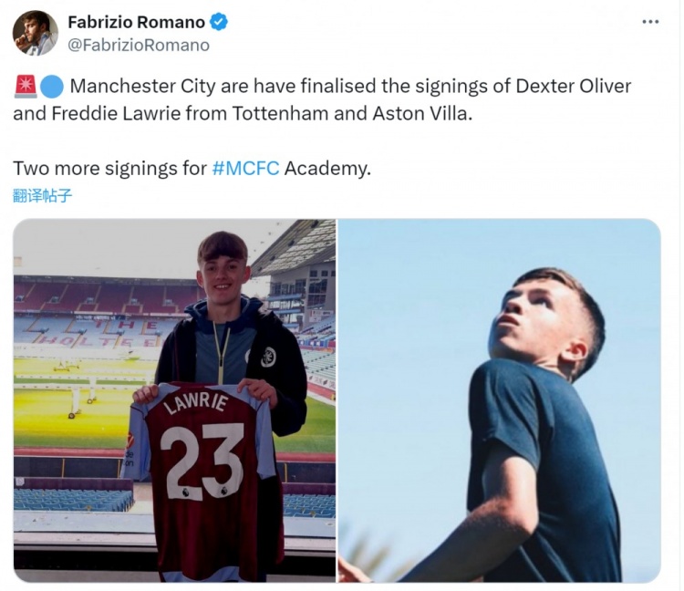 开云在线直播-罗马诺:曼城签下热刺16岁中场奥利弗、维拉16岁中卫劳里