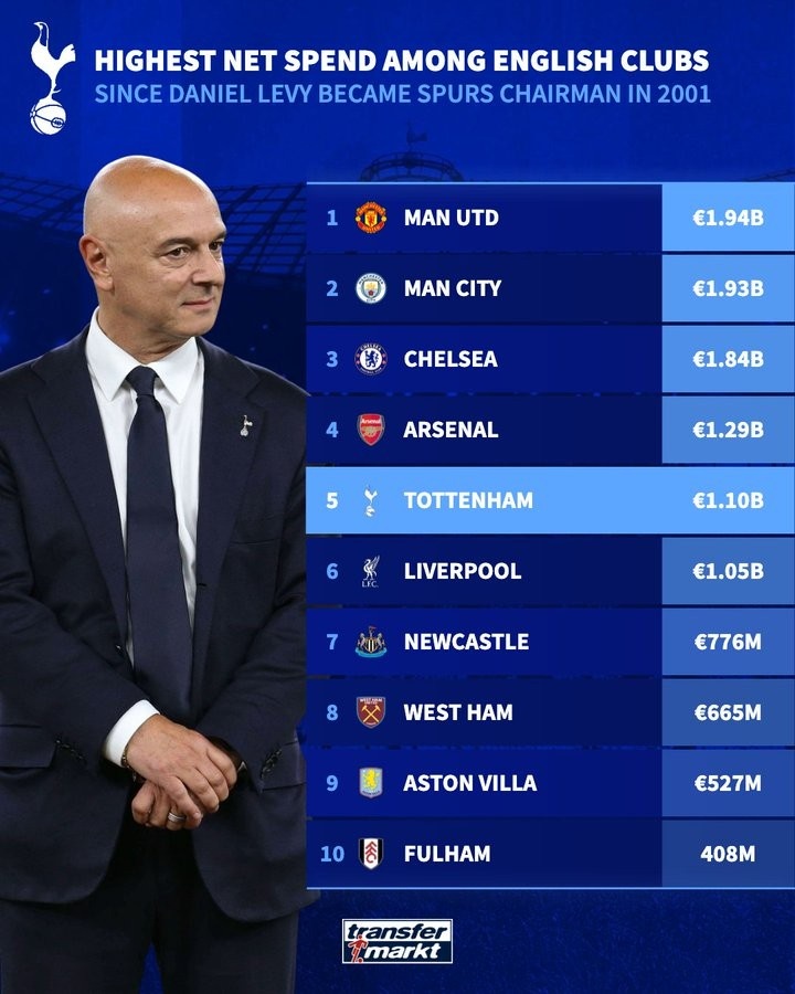 开云在线直播-列维01年入主热刺至今转会净支出11亿欧,同期英格兰球队第五